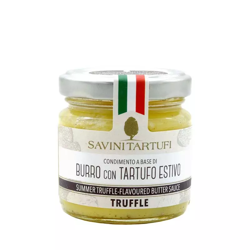 Butter with Black Truffle Savini Tartufi contains 5 % of truffle and can be kept out of the fridge until opening. Perfect to be spread on canapés and bruschetta but also as Pasta or Risotto sauce. It can also replace the classic butter in cooking. The truffle used for this preparation is Tuber aestivum Vitt., commonly known as Summer Truffle or Black Scorzone Truffle.