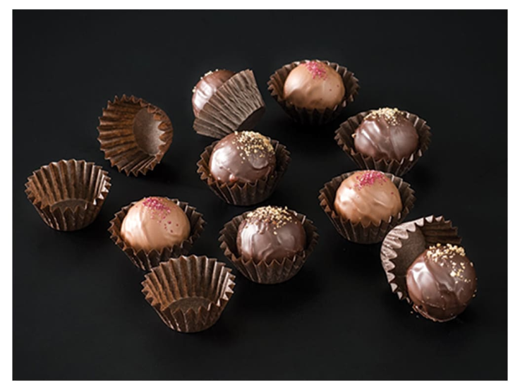 Caissette plissée brune “Kiosk” en boîte distributrice. Taille spécialement adaptée aux chocolats et aux confiseries.