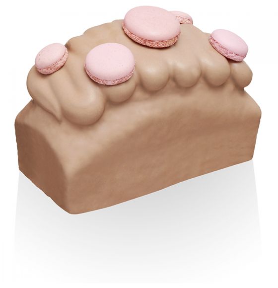 Biscuit au marron imbibé à la rose, éclats de marrons glacés, ganache au chocolat au lait et à la rose.