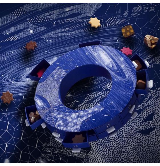 La cinquième édition du calendrier de l’Avent est proposée dans sa version classique propre à la Maison Pierre Hermé Paris. Féérie bleutée pour la couronne de Noël, qui, cette année, prend des allures d’anneau de Saturne.