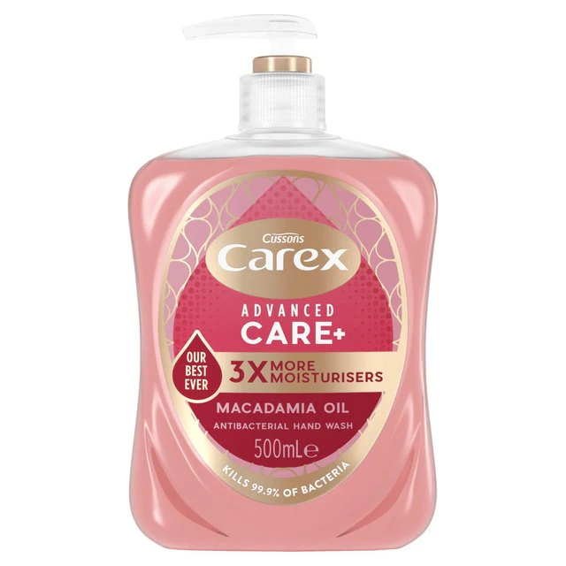 Carex Advanced Care Macadamia Oil Antibacterial Hand Wash comes with 3 x more moisturisers* for beautifully soft hands. This liquid soap with macadamia oil and vanilla extracts comes with an indulgent fragrance and creates a rich creamy lather. *Compared to Carex Original hand wash. The Advanced Care range is expertly formulated to be kind and gentle to keep skin feeling soft, whilst effectively removing dirt to leave hands feeling fresh and hygienically clean.
