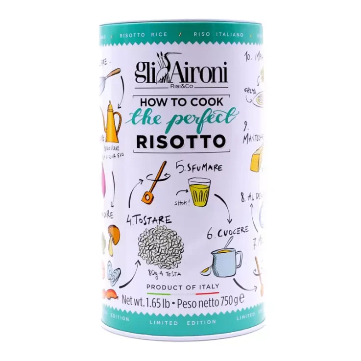 Discover Gli Aironi Carnaroli Rice 750g in tin ‘The Perfect Risotto’ , decorated with bright and colourful images illustrated by Gianluca Biscalchin. This special package not only contains the best Italian Carnaroli rice, but also guides you step by step to make a perfect risotto. Ideal as a gourmet gift for lovers of quality rice, it is a refined and original choice that combines taste and art. With ‘The Perfect Risotto’, it will be easy to prepare a chef’s risotto. Gli Aironi Carnaroli rice is unique on the market because it retains the Gem from the earliest stages of processing. This gives the grain a rough and elastic texture during cooking, with an ivory colour and intense aroma. The outer part of the grain helps maintain a perfect ‘al dente’ chewiness, even after cooking.