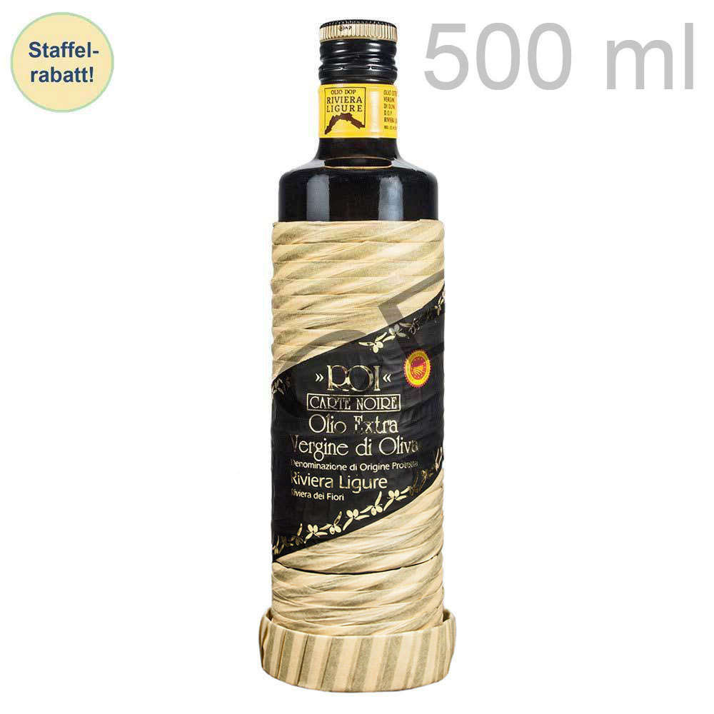 Dieses ausgezeichnete Olivenöl wird ausschließlich aus DOP- Taggiasca-Oliven gewonnen, die auf den historischen Terrassen des Valle Argentina wachsen. Dort ist die Wiege der Sorte Taggiasca. Der Name Carte Noire bezeichnete bislang ein Tropföl, das in einer alten Steinmühle erzeugt wurde. Jetzt werden die Oliven in einer hochmodernen Mühle unter Luftverschluss von Granitsteinen gemahlen. Das Öl mit einer nussigen, grünen Note ist jetzt noch fruchtiger. Es ist limitiert und jede Flasche ist nummeriert.