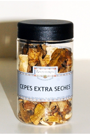 • Ingrédients : Cèpe séché (boletus edulis). Valeur énergétiques et nutritionnelles moyennes pour 100g: Energie: 1 297 kJ/2310 kcal Matières grasses 3,9g dont acides gras saturés 0,6g. Glucides 27g dont sucres 6,5g Protéines: 31g Sel: 0,02g