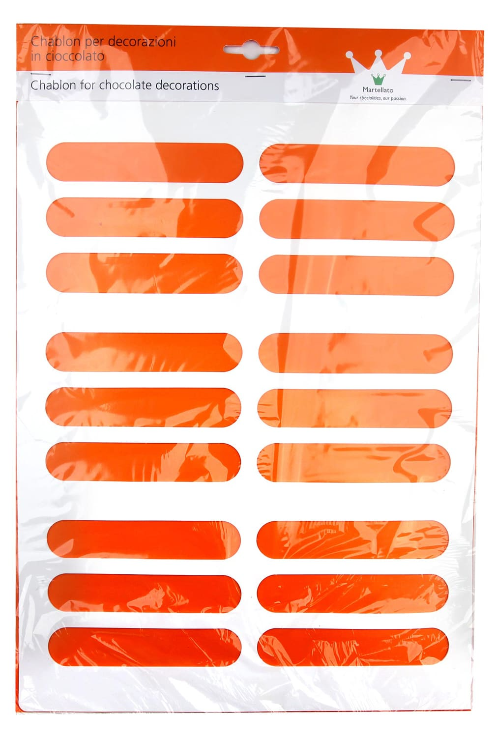 Chablon en silicone forme oblong permettant de réaliser un décor en biscuit, chocolat, sucre, sur un éclair.