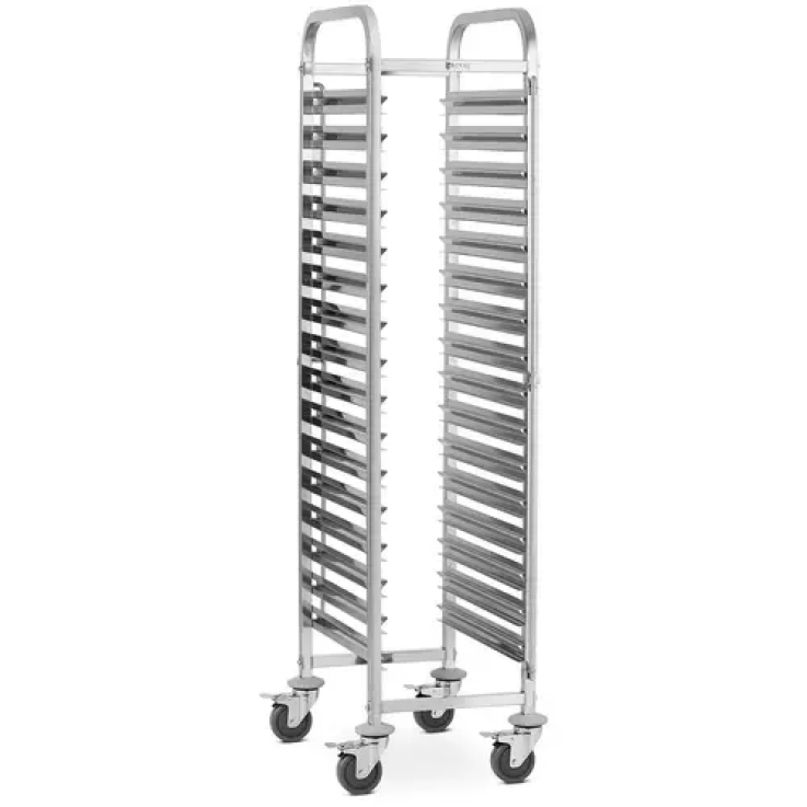 Le chariot échelle Royal Catering a été conçu pour un usage professionnel dans la gastronomie et ses domaines d’application sont nombreux. Avec une capacité allant jusqu’à 16 bacs GN, le chariot en acier inoxydable offre un grand espace de rangement et des possibilités d’utilisation flexibles. Afin de protéger les bacs au maximum lors du transport, des barres de sécurité verticales ont été installées pour empêcher le chargement de glisser. Pour pouvoir pousser le chariot le plus silencieusement possible et sans effort, celui-ci a été équipé de quatre roues en caoutchouc avec roulement à billes. Le chariot dispose également de freins, assurant ainsi stabilité et sécurité lors du chargement.