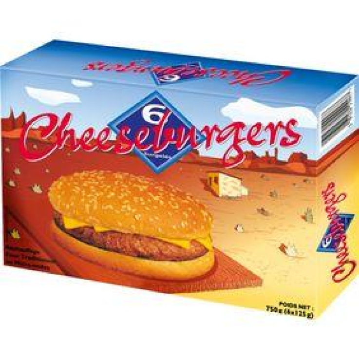 Préparation surgelée à base de pain spécial, de préparation cuite de viande hachée de boeuf, de fromage fondu et de sauce.
