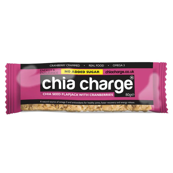 The Chia Charge Berry Flapjack No Added Sugar. Our balanced recipe enables a fast energy boost to be backed up with slower burn carbs, so there is no post gel crash in energy, you just keep moving forward with real food. We have created the perfect formulation for fuel that is delicious and easy to eat on the go. This recipe contains only wholesome ingredients that you would find in your kitchen cupboard.