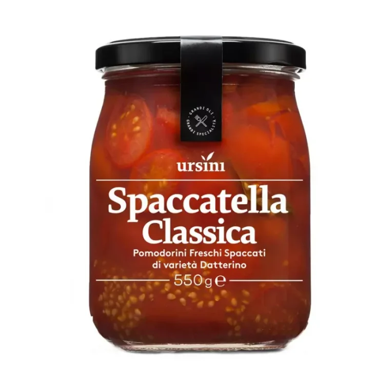 The Spaccatella Classica di Pomodorini Datterini Ursini 550gr offers all the flavour of delicious cherry tomatoes cut in half, dipped in tomato juice. Perfect for those who like to cook with simple, wholesome ingredients, this semi-prepared base requires only the addition of a little basil for an authentic flavour. Made with small round tomatoes, washed and split in half, Spaccatella is packed with care and a touch of basil, just as we would with cherry tomatoes from our own garden. Heat it up for 2-3 minutes and enjoy it with spaghetti for a simple and delicious dish.