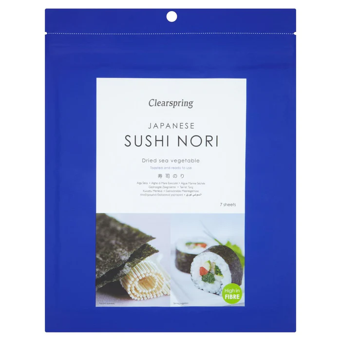 Sea vegetables have long been valued for their varied flavors, their versatility in use, and their natural goodness. Nori is cultivated in the sheltered bays around the Japanese coastline where after harvesting it is carefully washed, then slowly dried into square sheets. Gentle toasting of the Nori transforms them into translucent lighter green, crispy sheets with a delicious nutty flavor, proof of its excellent quality. Toasted and ready to use, High in fibre, Suitable for vegans