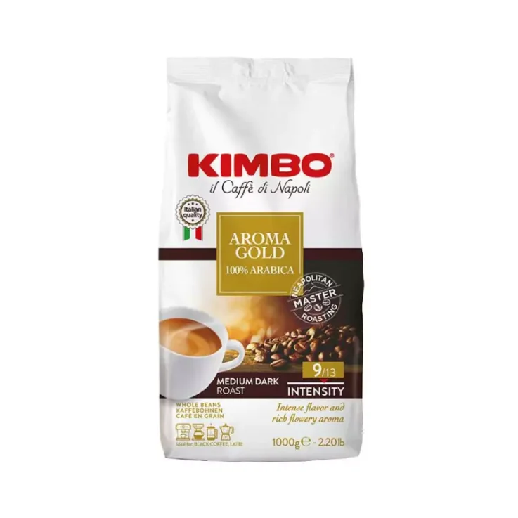 Kimbo Aroma Gold bean coffee is a fine blend obtained from 100% Arabica quality beans carefully selected in their native countries. A perfect balance of sweetness and the right acidity, with delicate almond notes that leave a sweet and refined aftertaste. Ideal for black coffee and latte.