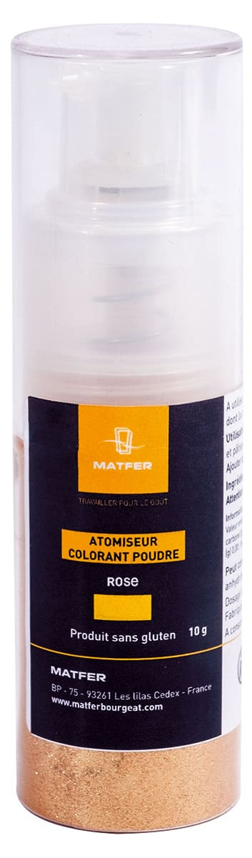 Colorant alimentaire en poudre en atomiseur. Emploi très facile Pour la décoration de surface en pâtisserie, chocolaterie. Poudre fine, aspect métallisé.