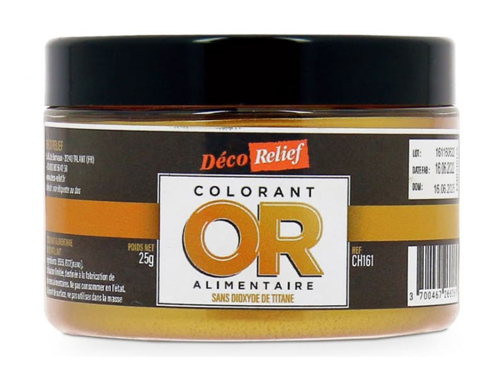 Ce colorant or alimentaire en poudre s’utilise comme colorant de surface, il ne doit pas être incorporé dans la masse.