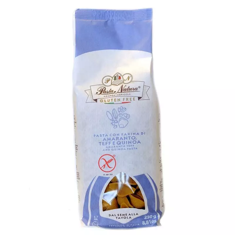 Gluten Free Conchiglie with Amaranth, Teff and Quinoa Pasta Natura are a type of pasta with perfect coarseness and hold during cooking, ideal for people with celiac disease but also for those who want to try a pasta with an original taste and easy digestibility. To preserve all the flavor of the pasta until your table, drying is slow and at low temperatures.