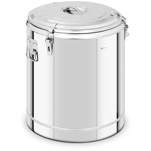 Ce conteneur isotherme possède une contenance de 80 litres. Le corps et le fond du récipient se composent de deux parois en inox à l’épreuve de la chaleur. Une couche supplémentaire logée entre les feuilles d’inox assure en outre l’isolation thermique du conteneur. Grâce à cette conception, la température des plats et des boissons demeure stable jusqu’à douze heures durant.