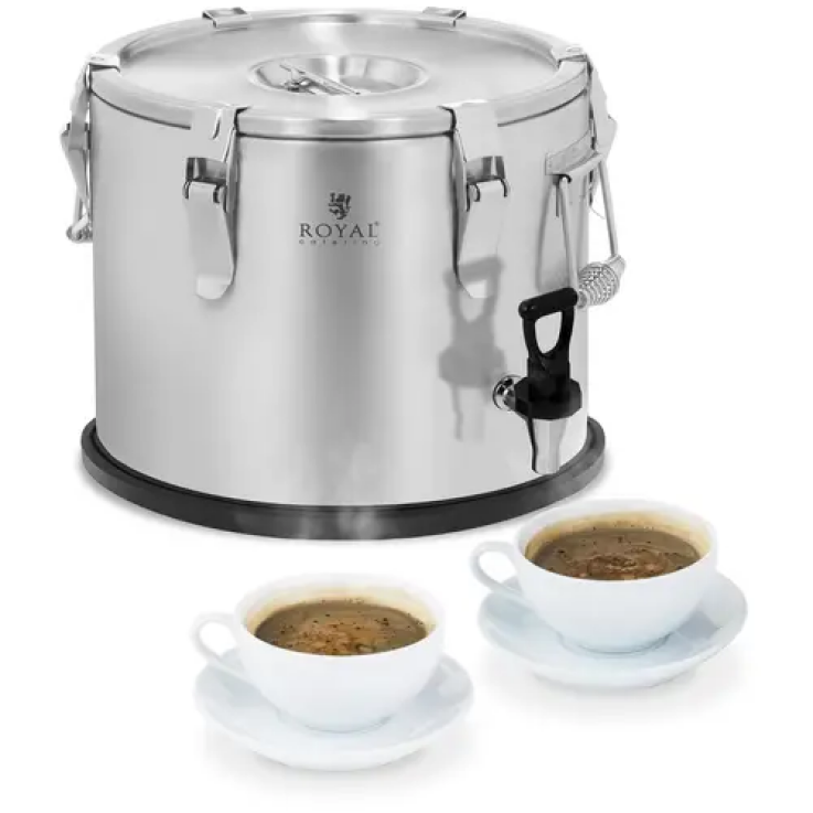 Le conteneur isotherme à robinet dispose d’un volume de 15 litres. Le récipient et son socle sont fabriqués d’une double paroi d’isolation en acier inoxydable thermorésistant. Entre les deux parois d’acier inoxydable, se trouve une épaisse couche d’isolation de 1,5 cm d’épaisseur. Grâce à cette double isolation, la température des aliments et des boissons est maintenue pendant une durée de six à huit heures.