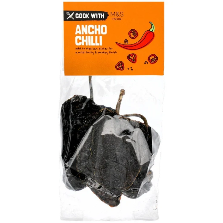 Cook With M&S Ancho Chili. Add these dried ancho chilies to Mexican dishes for a mild fruity and smoky finish. Rehydrate before using. Our Cook with M&S range includes 100s of time-saving ingredients that make cooking dinner easy.