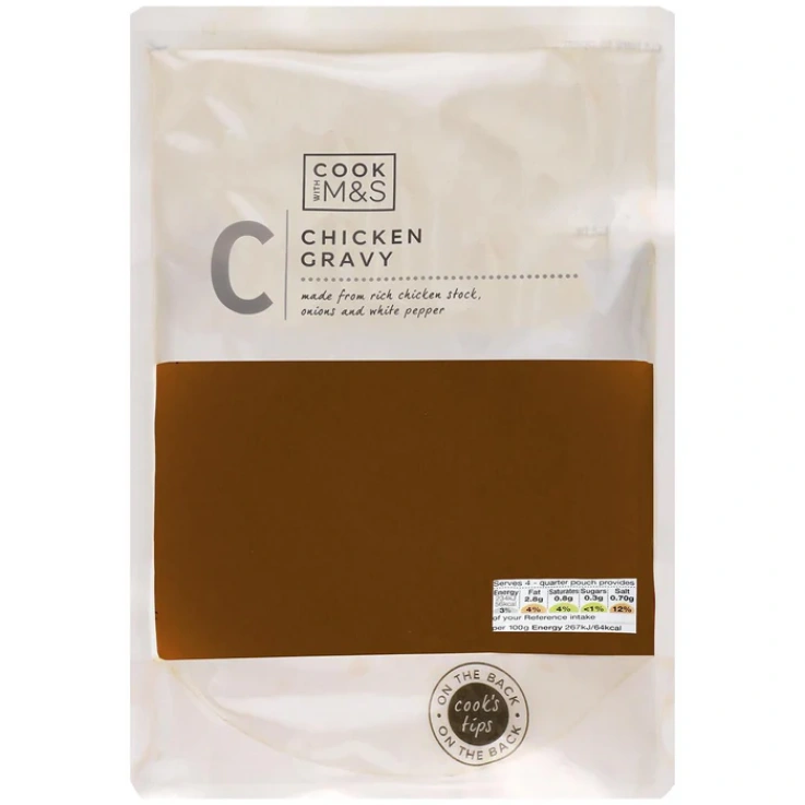 Cook With M&S Chicken Gravy. Made with chicken stock, onions and white pepper, this rich gravy is great for pouring over roast chicken and vegetables. Heat over the hob or in the microwave. Serves 4. Our Cook with M&S range includes 100s of time-saving ingredients that make cooking dinner easy.