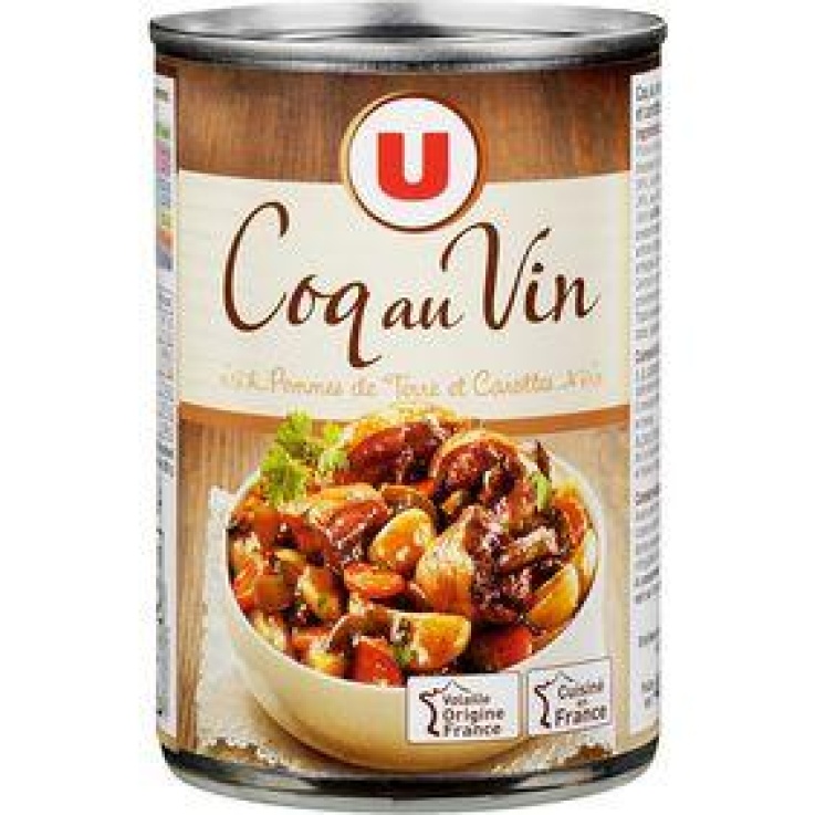 Pilons et hauts de cuisse de poule non dĆ©sossĆ©s et prĆ©cuits (origine : France) 36%, pommes de terre (dont SULFITES) 24%, eau, carottes 9%, vin rouge 5,2% (dont SULFITES), champignons, oignons, amidon transformĆ© de maĆÆs, farine de BLE, arĆ“mes naturels, concentrĆ© de tomate, sel, armagnac, ail en poudre, extrait de malt d’ORGE. Certains ingrĆ©dients de ce produit ne proviennent pas de France. Traces Ć©ventuelles de lait, cĆ©leri, oeuf, moutarde, poisson, crustacĆ©s et mollusques