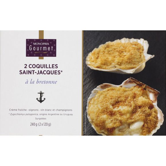 Appartenant à la famille des pectinidés, la coquille Saint-Jacques affole le palais de tous les gourmets. Avec sa chair généreuse et délicate, ses saveurs iodées et sa belle coquille en éventail, la Saint-Jacques est un produit noble que l’on retrou ve habituellement sur toutes les tables pour les fêtes de fin d’année. Servies à la bretonne, dans une sauce composée de crème fraîche, oignons, vin blanc et champignons, les coquilles Saint-Jacques Monoprix Gourmet sont idéales pour toutes les occa sions spéciales.
