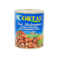 To serve, warm gently, add lemon juice, salt, garlic and oil to taste. These fava beans are from Lebanon.