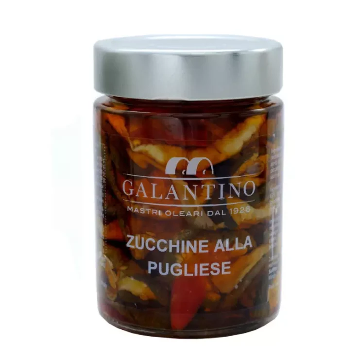 Courgettes in olive oil is one of those preserves that can’t be missing in the pantry. It is perfect to enrich appetizers or to be served on hot bread. These courgettes by Galantino are preparade following a typical Apulian recipe and they are enriched with Chilli Peppers, capers, mint and garlic. Only fresh vegetables are used, preserved in Extra Virgin olive oil Galantino.