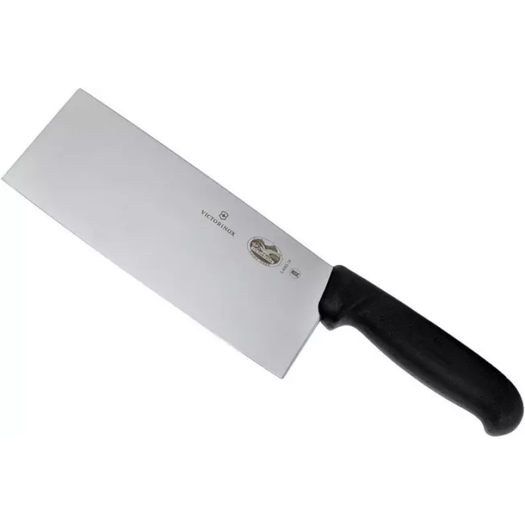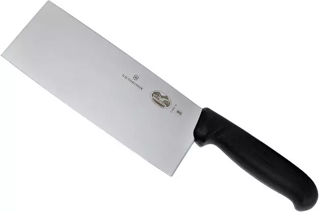 La forme de ce couteau de chef chinois Victorinox Fibrox ressemble à celle du couperet, mais ne vous y trompez pas, ce n’est pas un couperet ! Alors que la lame d’un couperet est robuste, la lame d’un couteau de chef chinois est très fine et tranchante comme un rasoir. Et donc pas adapté pour hacher, mais pour couper finement les légumes et les herbes et écraser l’ail.