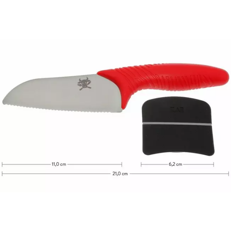 Tim Mälzer a créé un couteau spécial pour les enfants, afin que les passionnés de Kai Shun puissent transmettre leur passion à la prochaine génération. Il est convaincu que lorsque les enfants peuvent aider à la cuisine, ils apprendront et seront plus conscients de la nourriture. Ce qui est important pour le reste de leur vie ! Bien sûr, ils doivent pouvoir travailler en toute sécurité et c’est pourquoi ce couteau a un manche relativement large avec des arêtes. Le protège-doigts, dimensions 6,2×5,8 cm, protégera le chef inexpérimenté des petits accidents. Le protège-doigts a une bande flexible, de sorte qu’il peut se plier avec les doigts. Bien sûr, la surveillance reste prudente, mais les enfants peuvent aider en toute sécurité dans la cuisine avec ce couteau.