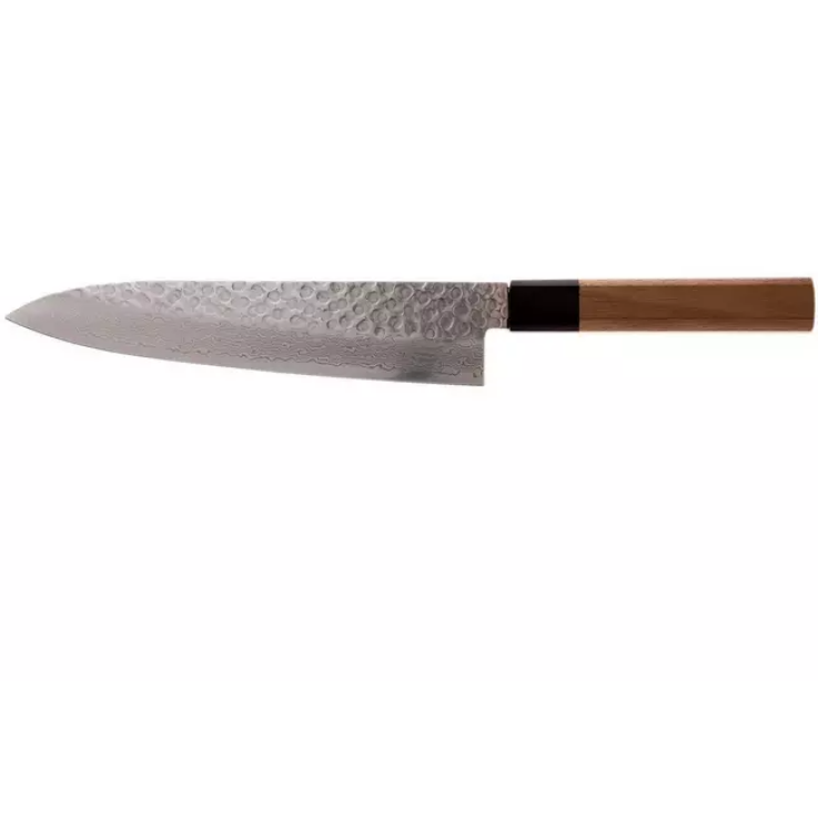 Le couteau de chef 21 cm de la collection Damascus WA 45 couches de Sakai Takayuki. Ce couteau de chef, également appelé gyuto, est le couteau de taille moyenne parmi trois couteaux de chef de la collection.