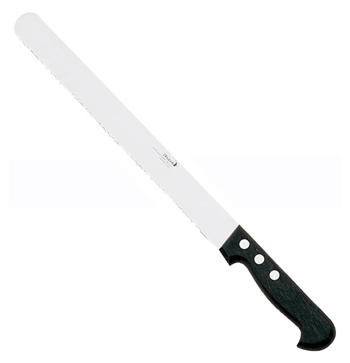 • Couteau-scie à génoise (ou entremets). Lame en acier inoxydable pleine soie, manche ABS, 3 rivets, mitre alu rapportée.