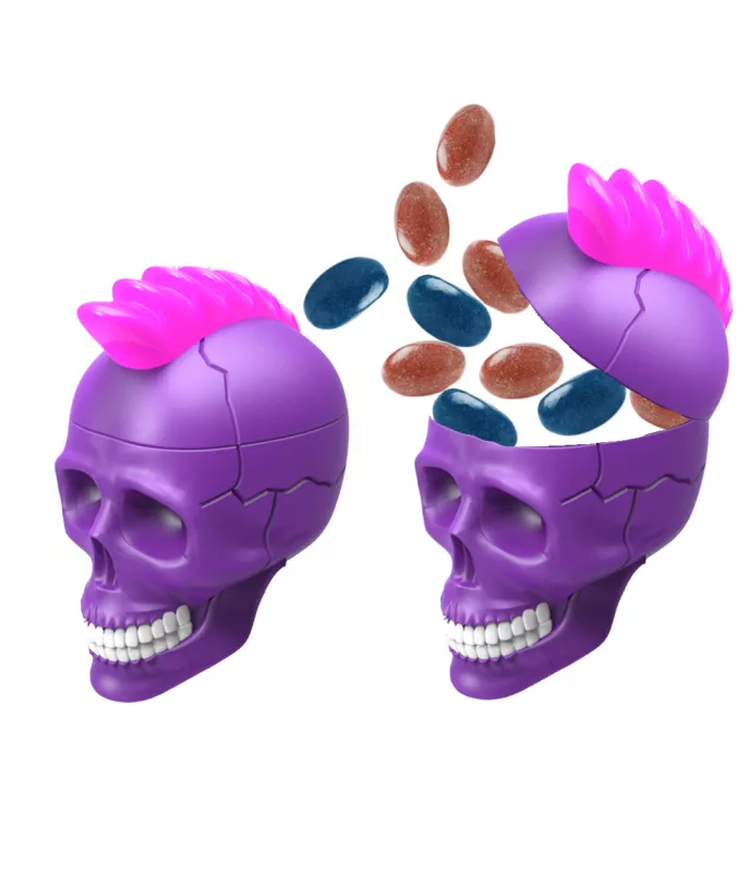 WOM – Bonbon haricot gélifié contenu dans une boîte en plastique en forme de tête de mort coloré. Vendu en gros conditionnement sur carton présentoir contenant 9 unités.
