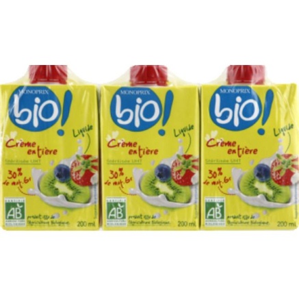 Crème entière liquide stérilisée UHT 30% de matières grasses issue de l’agriculture biologique