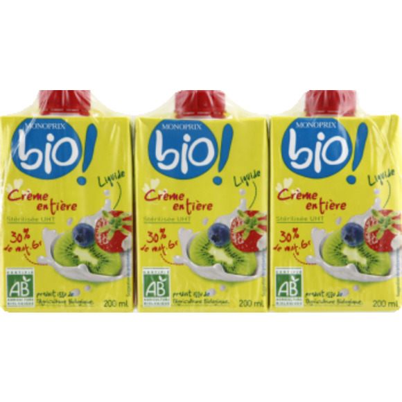 Crème entière stérilisée UHT, 30% de matière grasse, issue de l’agriculture biologique