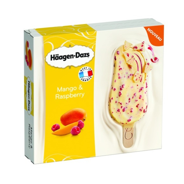 Crème glacée à la mangue et sauce à la framboise (9%) avec un enrobage au chocolat blanc Belge (21%) et morceaux à la framboise sucrés (1%).