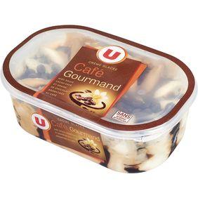 Crème glacée café 48,5%, crème glacée vanille 32,3% avec sauce cacao-café 16,2% et grains de chocolat aromatisés au café 3%.