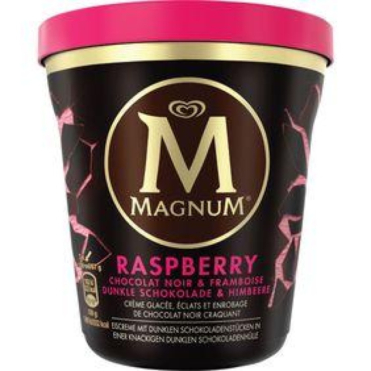 Crème glacée framboise avec des éclats et une coque de chocolat noir (28%).