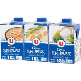 Crème légère semi-épaisse à 18 % de matière grasse – stérilisée UHT CREME légère 97%, amidon transformé de maïs, stabilisants : pectine – carraghénanes, émulsifiant : E472e. /