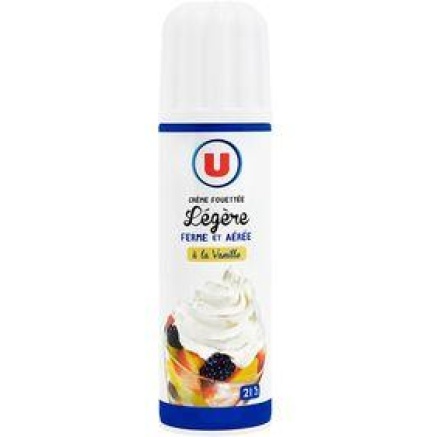CREME légère à 23% de matière grasse 93%, sucre 6,5%, émulsifiants : mono et diglycérides d’acides gras – esters lactiques des mono et diglycérides d’acides gras, stabilisant : carraghénanes, arôme naturel de vanille,gaz propulseur : N*O. /