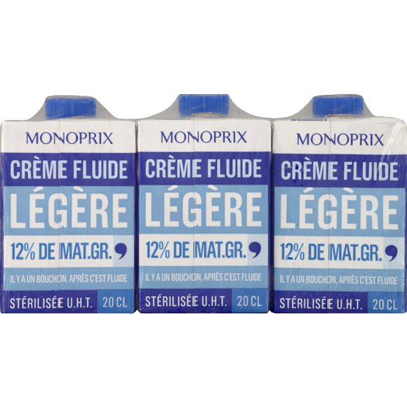 Crème légère stérilisée UHT à 12% de matières grasses Pays de fabrication : FRANCE DLC minimum garantie: 7 jours Monoprix Exploitation Monoprix Exploitation 92116 Clichy Cedex