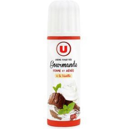 Crème fouettée sucrée vanillée à 27% de matière grasse sous pression, stérilisée UHT.