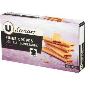 Crêpes dentelle nature U Saveurs 85g Farine de BLE (France), sucre, BEURRE pâtissier (France) 16%, LAIT écrémé en poudre, sel, extrait de malt d’ORGE, poudre à lever : carbonates de sodium.