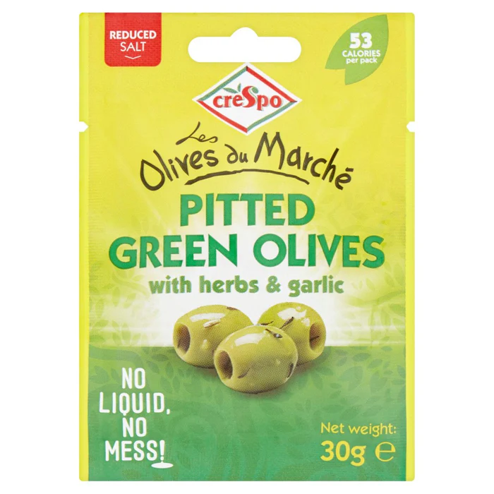 Pitted Green Olives with Herbs & Garlic. The best olives are selected, pitted and marinated to allow the flavor of the herbs and garlic to infuse the olives. Les Olive du Marché bring the true flavor of the Mediterranean to your salads, parties and everyday snacks. No liquid, no mess! 53 calories per snack, reduced salt.