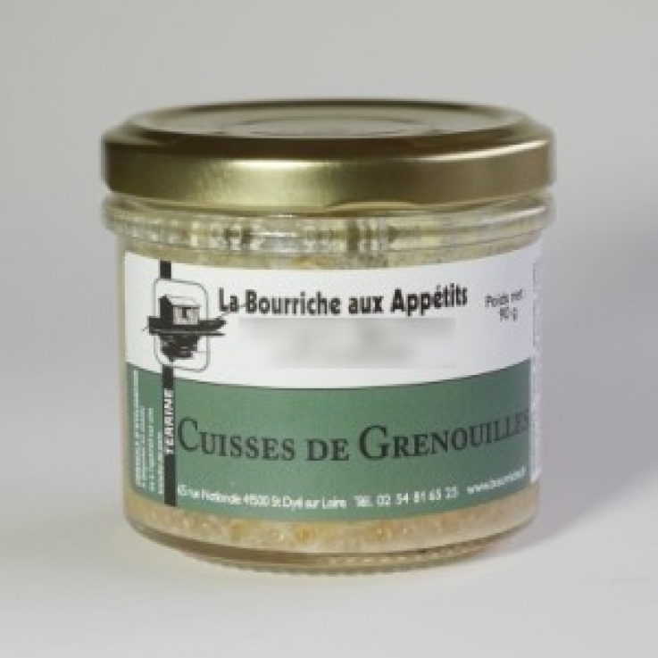 Cuisse de grenouille (30%), gorge de porc*, poitrine de porc*, lard fumé*, foie de poulet*, oeuf, vin blanc (sulfites), échalote, ail, fécule de pomme de terre, protéines de lait, sel, gélatine, poivre blanc.