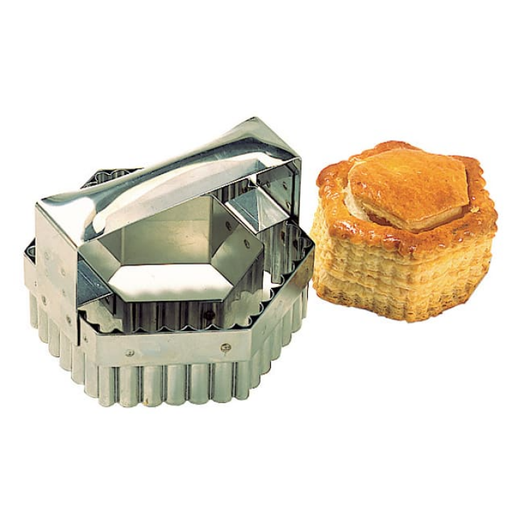 Découpoir à poignée, découpe extérieure cannelée et intérieure lisse. Permet la découpe en une seule opération de croustades à garnir. En acier inoxydable.