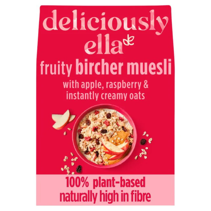Our fruity bircher muesli is a family favorite. We finely mill the gluten free oats, before stirring in chopped red apple, raisins and raspberry pieces for a little sweetness. We finish with sunflower seeds and chia seeds for texture. Simply add milk or juice, and it will go soft and creamy in seconds. It takes time to create the perfect muesli, so we make each bag in small batches. 100% plant-based, Naturally high in fiber, Natural source of protein, 6 plant-based foods, Gluten free, No preservatives or additives, Vegan friendly. Suitable for Vegetarians.
