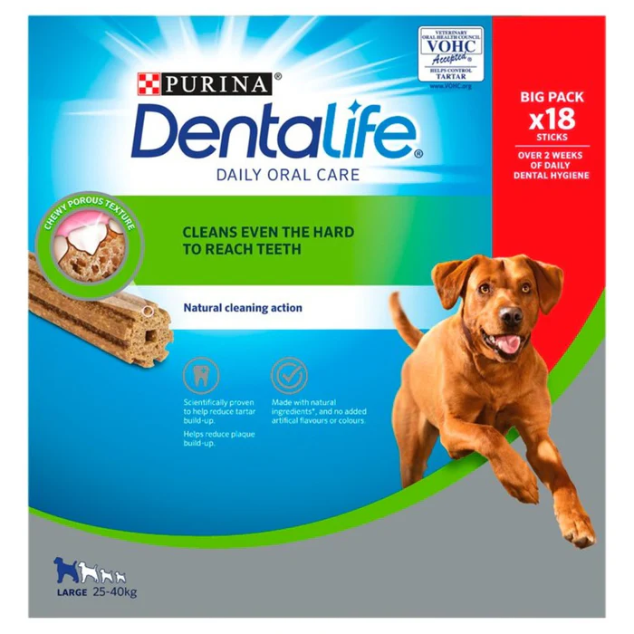 Complementary pet food for adult dogs. Daily oral care, Cleans even the hard to reach teeth, Chewy porous texture, Natural cleaning action, Scientifically proven to help reduce tartar build-up, Help reduce plaque build-up, Ridges to massage the gumline, Deep clean with back mouth action, One stick per day, Contributes to fresh breath, No added sugar, Low in fat, Tasty recipe, Wholesome ingredients (corn, wheat), Vitamin D & calcium for strong teeth, Made with natural ingredients, No added artificial flavors or colors.