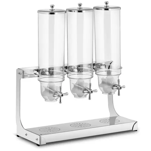 Le distributeur de céréales RCCS-3.5LSS3 de Royal Catering, votre expert en matériel de restauration, est un plus pour tous les buffets où l’on propose de délicieuses céréales en libre-service – à l’hôtel comme au restaurant, au café ou même à la maison. Son design et sa finition comblent toutes les attentes, tandis que son fonctionnement aussi simple que génial enthousiasme ceux qui l’utilisent.