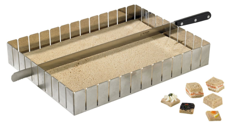 Ossature inox équipée d’une planche de polyéthylène 40 x 30 cm facilitant la coupe des parts égales des canapés, mousses, pâtes de fruits, ganaches…