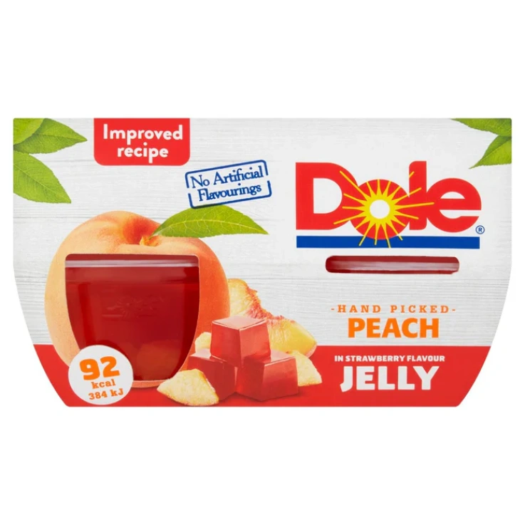 Fruit Bowls. Dole Fruit in Jelly makes eating fruit fun and convenient by combining real fruit pieces with tasty fruit jelly. BPA-Free Packaging, No artificial flavorings, Hand Picked, 92 kcal 384 kJ
