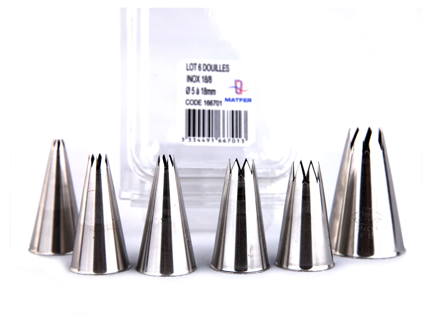 BoĂ®te de 6 douilles cannelĂ©es en acier inoxydable monobloc, sans bord roulĂ©. A 8, B 8, C 8, D 8, E 8, F 8. RĂ©pondent aux exigences de l’hygiène.